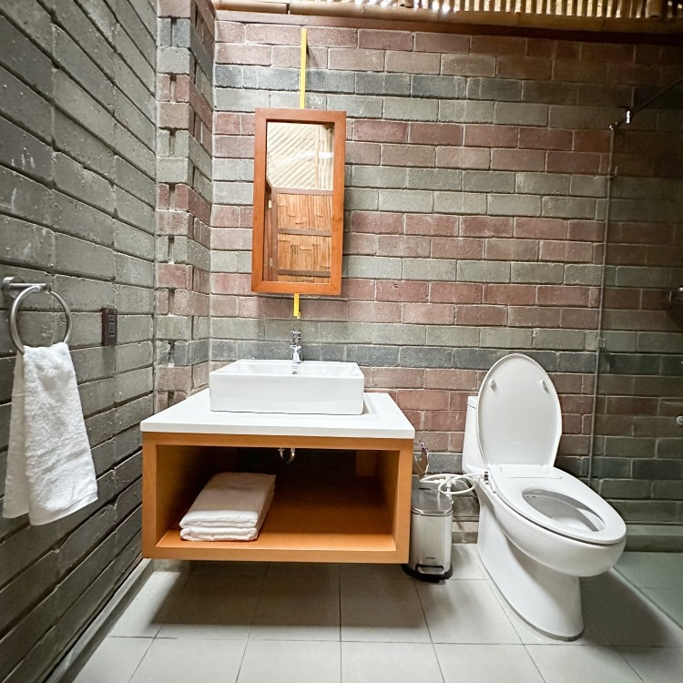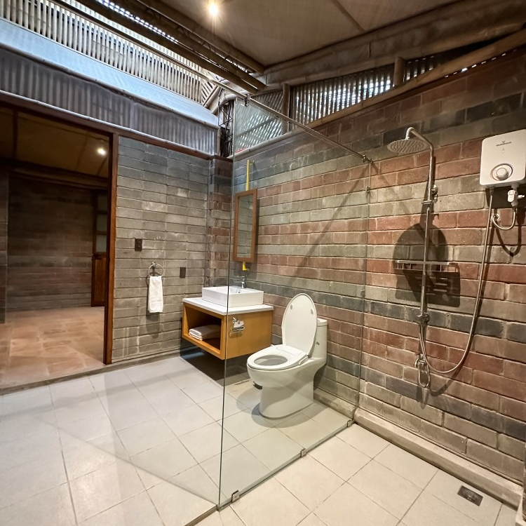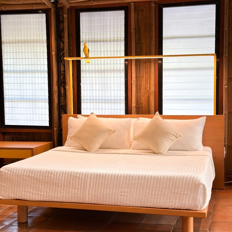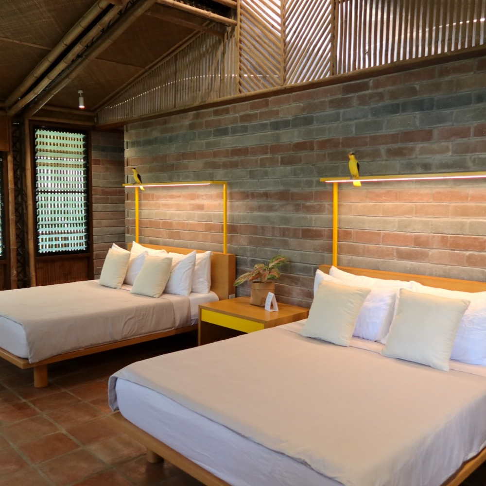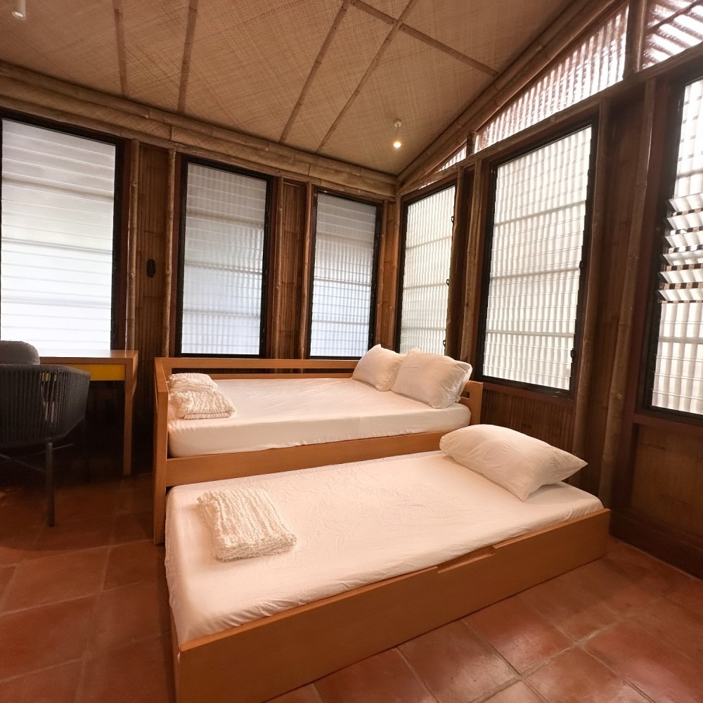 Inside, every detail tells a quiet story: banig ceilings woven by women from a small island municipality in Batangas, walls made from ecobricks that give new life to thousands of plastic sachets, and furnishings crafted from recycled materials. With high ceilings, warm natural textures, and window walls that open to generous views of green, each cabin offers a restful retreat shaped by mindful choices.