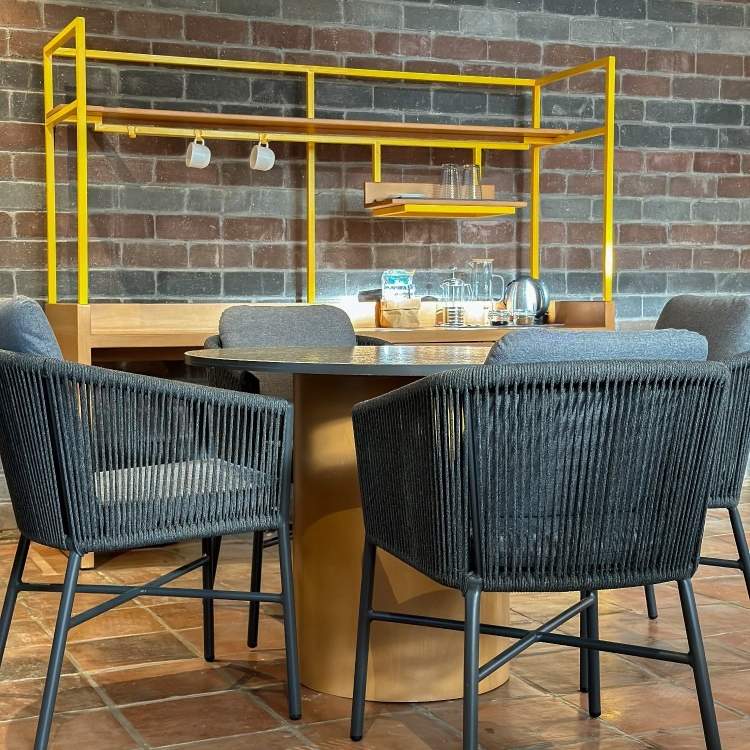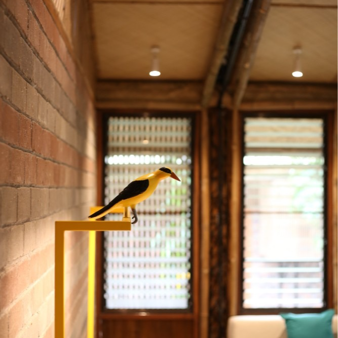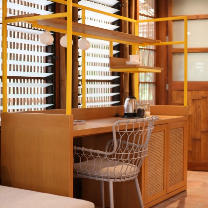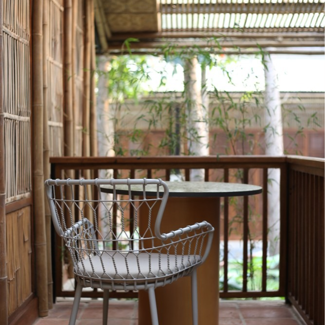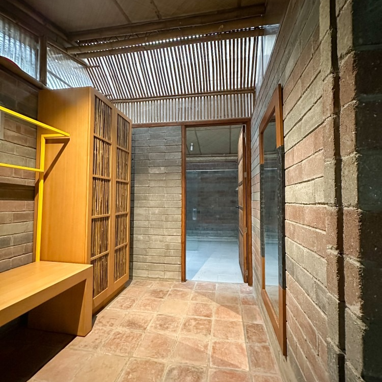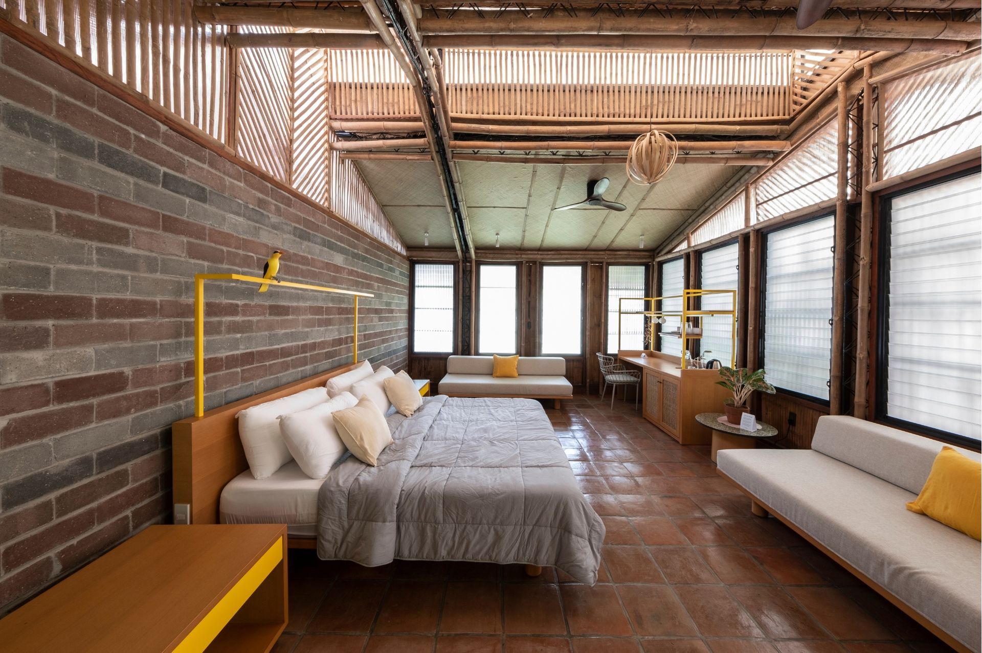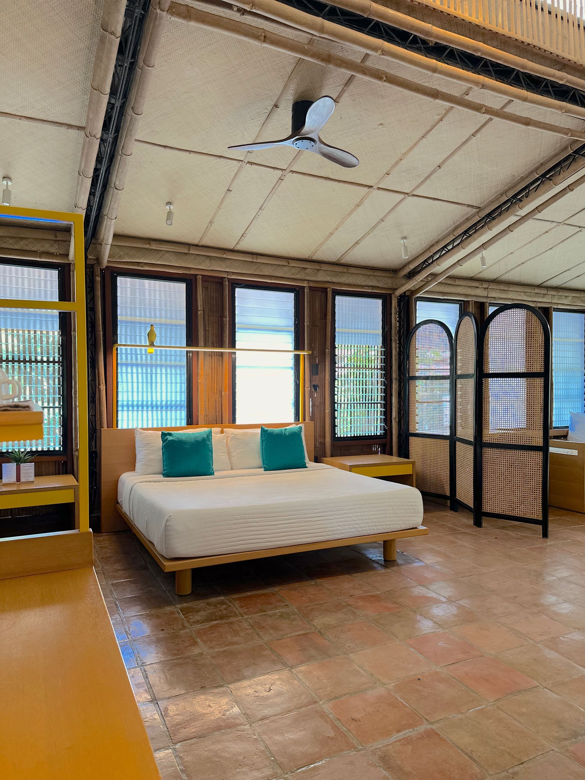Inside, every detail tells a quiet story: banig ceilings woven by women from a small island municipality in Batangas, walls made from ecobricks that give new life to thousands of plastic sachets, and furnishings crafted from recycled materials. With high ceilings, warm natural textures, and window walls that open to generous views of green, each cabin offers a restful retreat shaped by mindful choices.