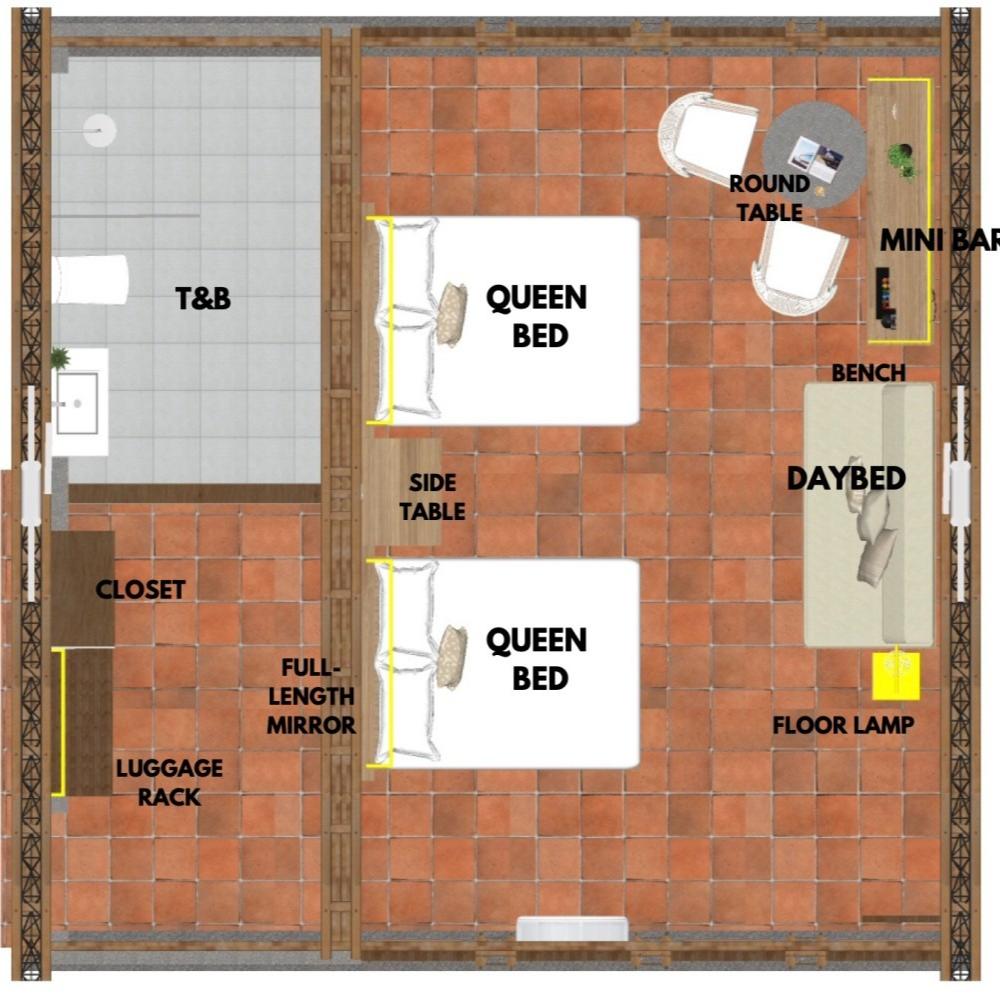 Furnished with two queen beds, a day bed, an en suite toilet and bath, a study desk with a mini bar and a balcony set, our Queen cabins are ideal for small families or a group of friends. The standard capacity is 4 persons, while maximum occupancy, subject to additional charges, is 6 persons. Rates quoted are inclusive of breakfast for all guests, farm tour with animal feeding, guided leaf art session for kids, and access to all amenities.
