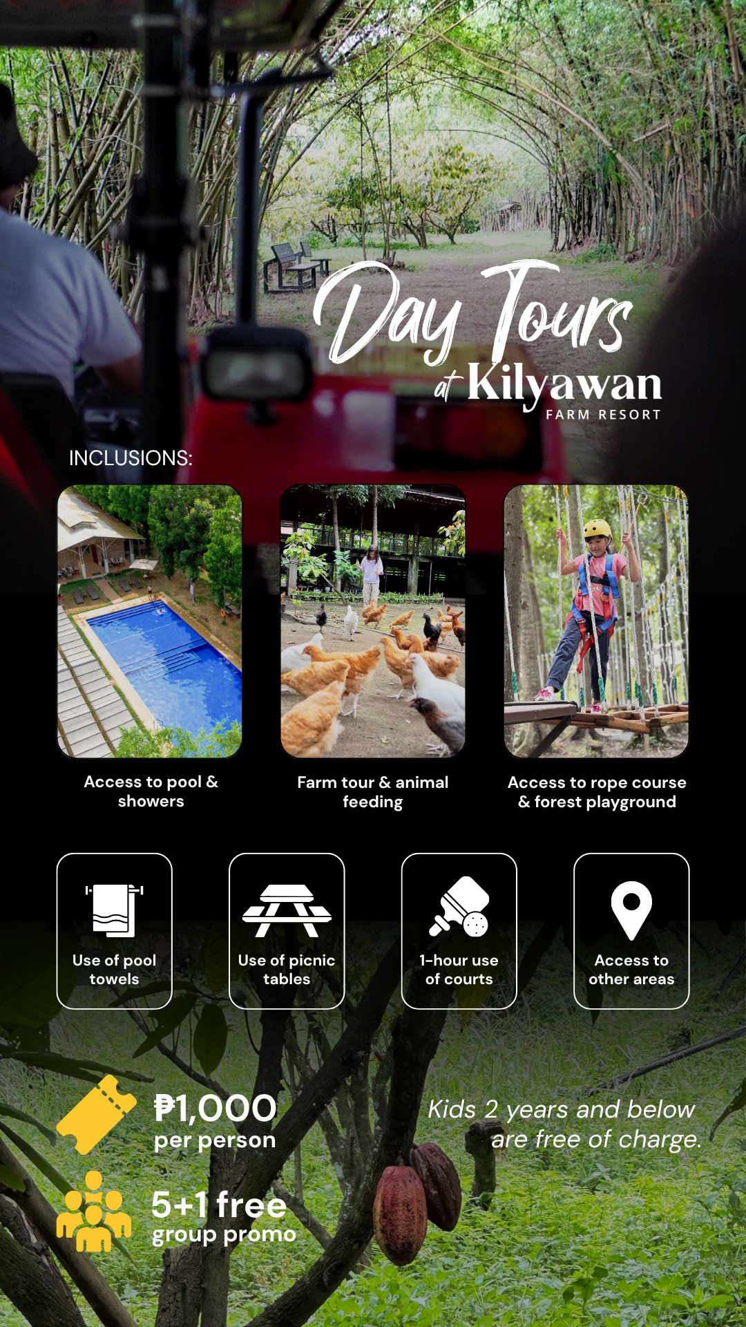 Kilyawan Farm Resort offers a space for learning beyond the classroom, where students can explore, create, and connect with nature through hands-on experiences. Each visit is designed to engage the senses and introduce simple lessons in sustainability and the natural environment. Students can wander through the cacao and bamboo orchards on a nature scavenger hunt, create artwork using dried leaves and natural materials, and tour the farm on a tractor while interacting with native animals. They can also learn to prepare simple farm-to-table dishes and discover how tsokolate is made.